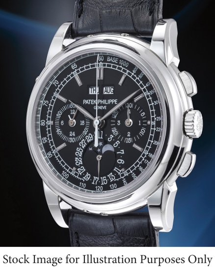 12: Ref. 5970P-001 A highly rare and attractive platinum perpetual chronograph wristwatch with moon phases, 24-hour indication, leap year indication, certificate of origin, additional case back, hang tag, setting pin and presentation box, single sealed