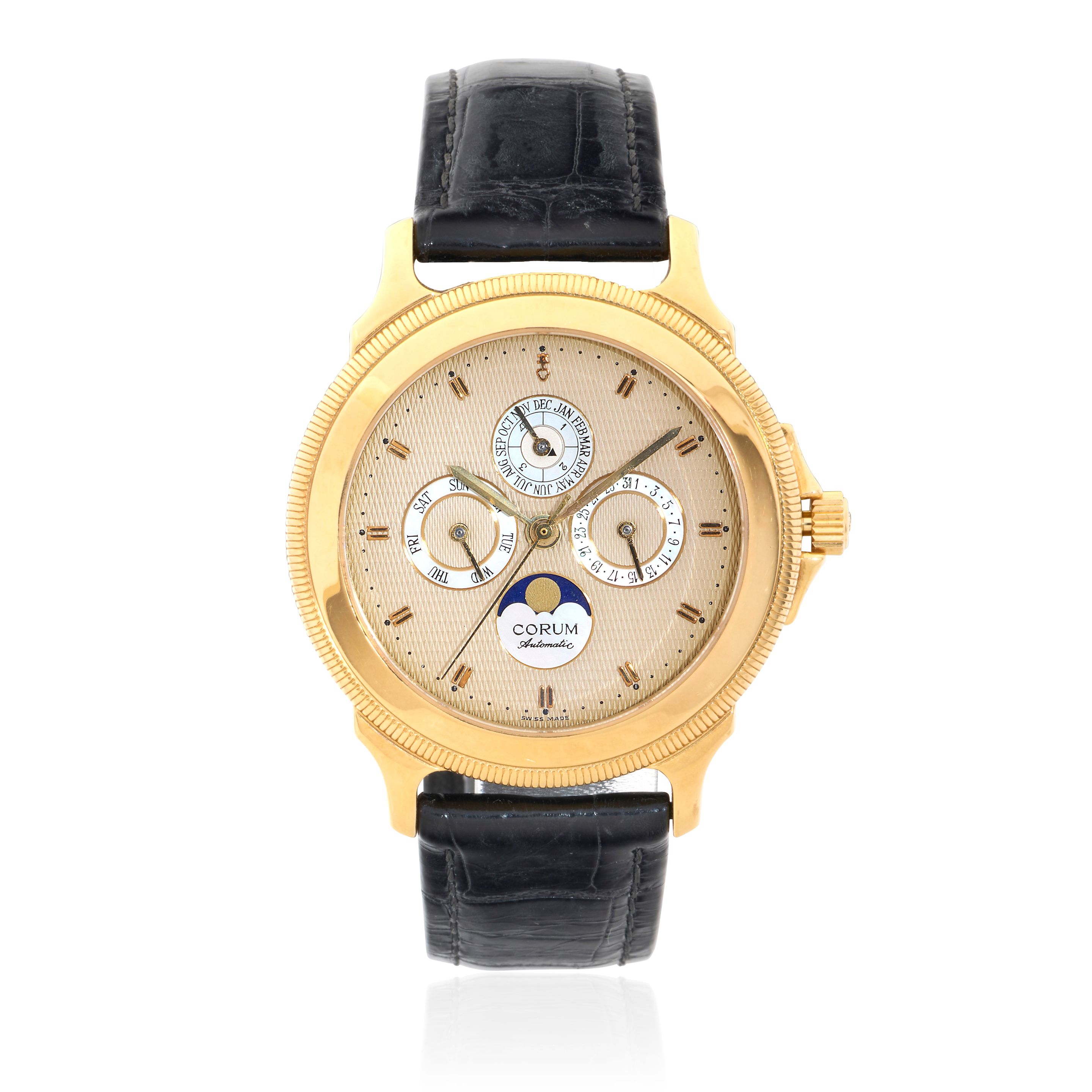 116: Corum. A Limited Edition 18K gold automatic perpetual calendar wristwatch with moon phase and mother of pearl dial Perpetual Temps Mecanique, Ref 84.111.56, No.62/100, Circa 1995