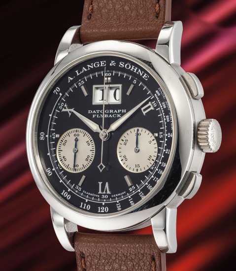 124: Ref. 405.047 A stunning and unique white gold flyback chronograph with outsize date, power reserve indication, hinged caseback and bracelet with proceeds going to charity