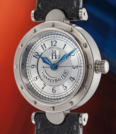 136: An outstanding and exquisite white gold wristwatch with guilloché dial, direct impulse dual wheel escapement, additional black enamel dial, additional hands,and presentation box