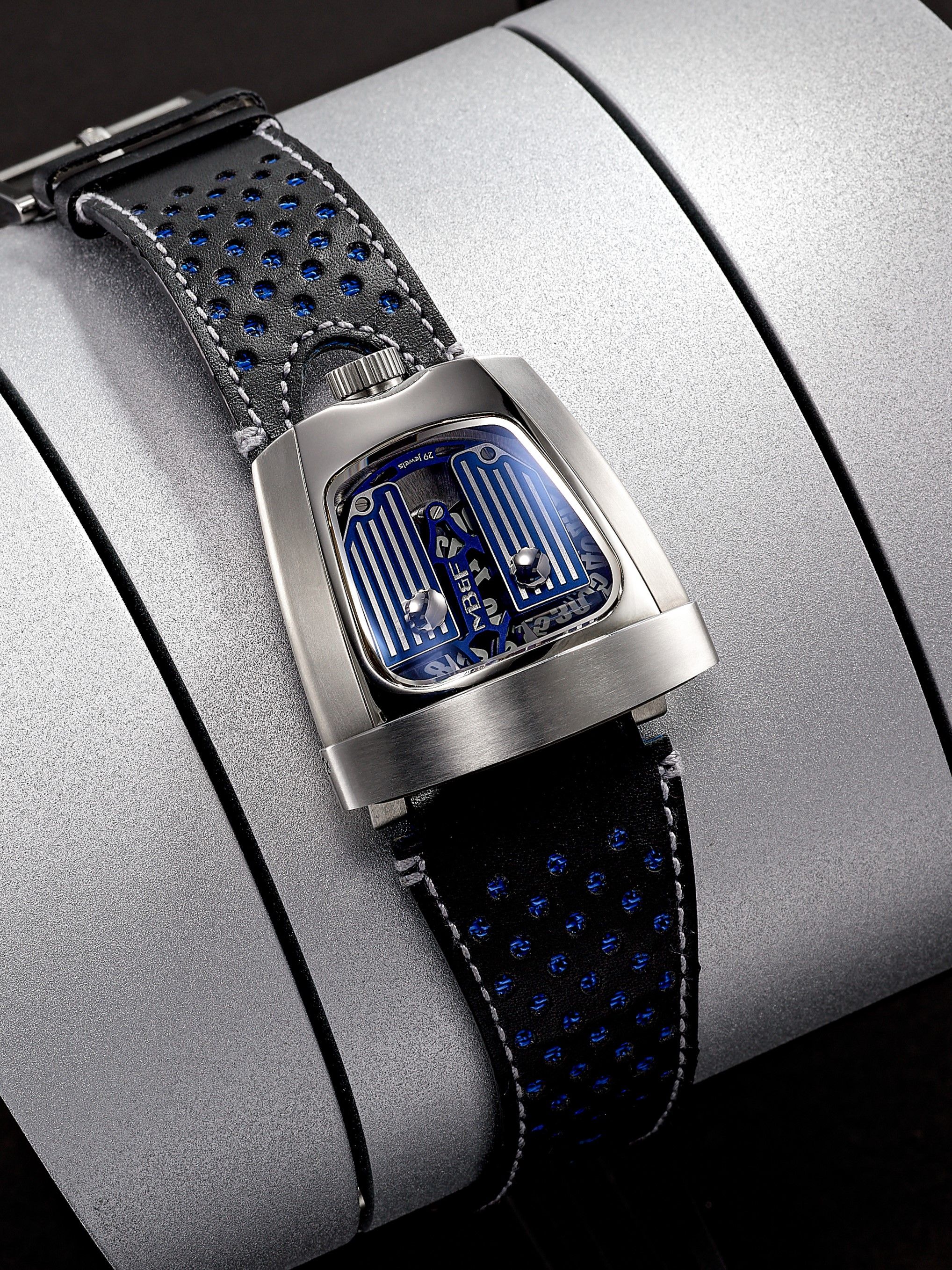 1003: MB&F HMX BLUE, REFERENCE 56.STBL.B, A RARE LIMITED EDITION TITANIUM AND STAINLESS STEEL THREE-DIMENSIONAL BI-DIRECTIONAL JUMPING HOUR WRISTWATCH WITH LATERAL TIME DISPLAY, MADE TO COMMEMORATE THE 10TH ANNIVERSARY OF THE BRAND, CIRCA 2015