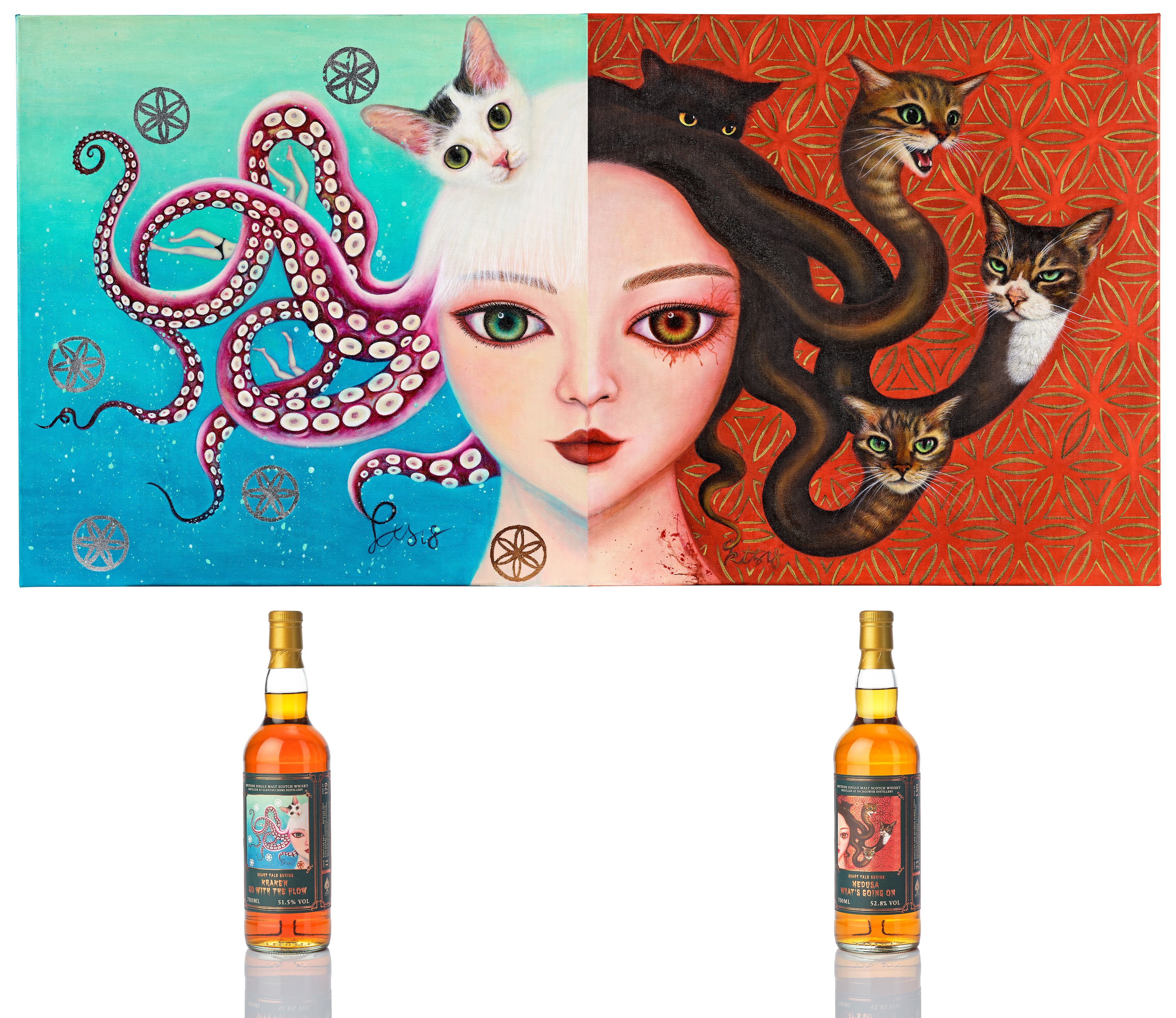 17: Katy Ku (kt518) A Set of Two Paintings with Corresponding Whiskies