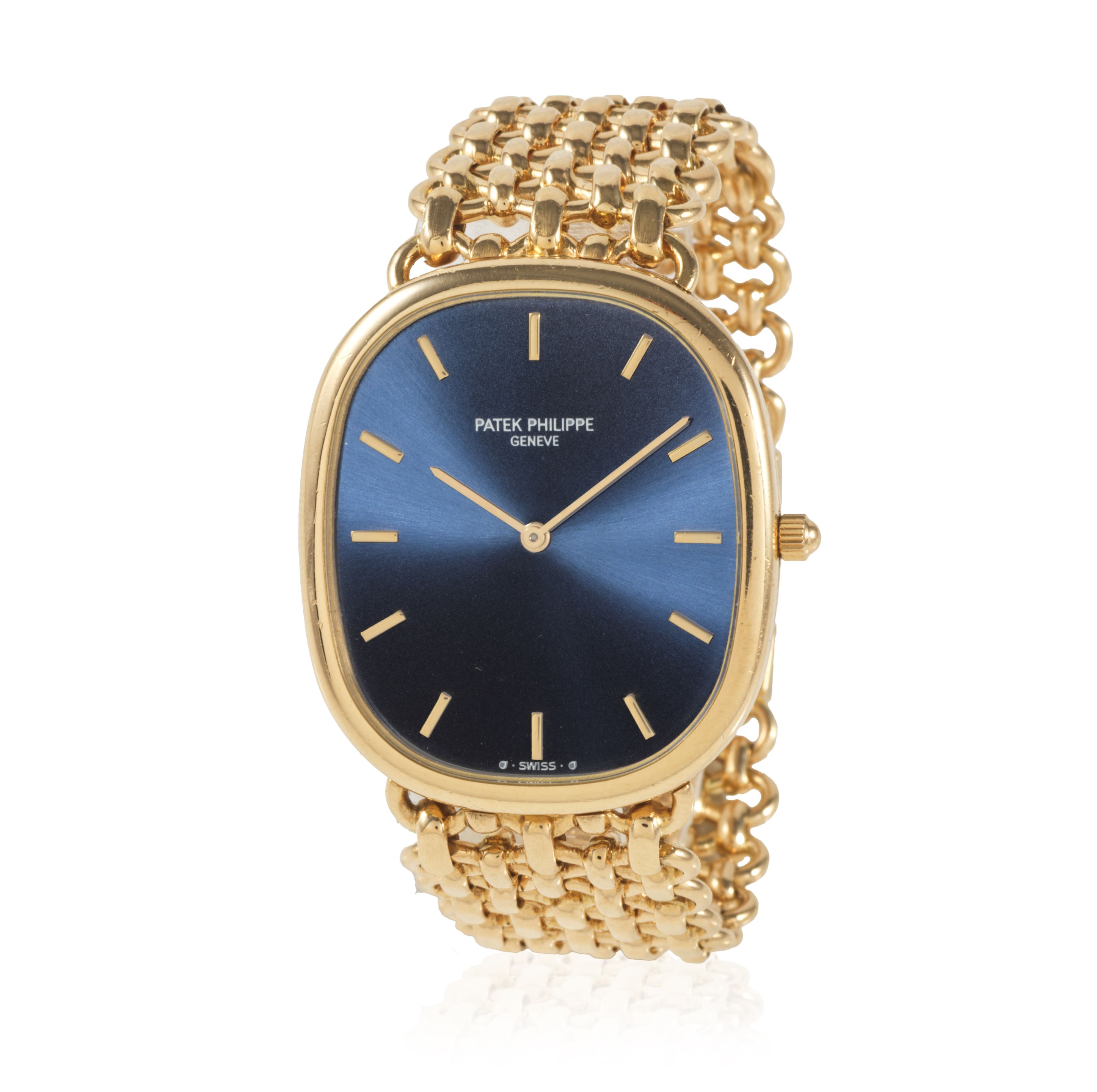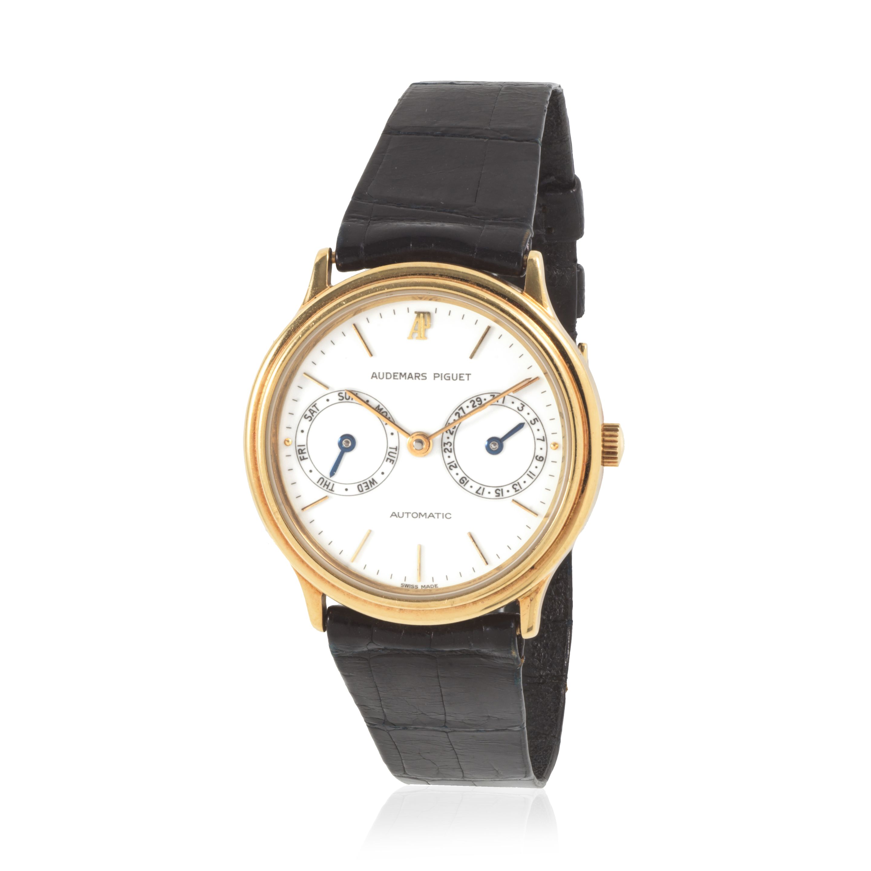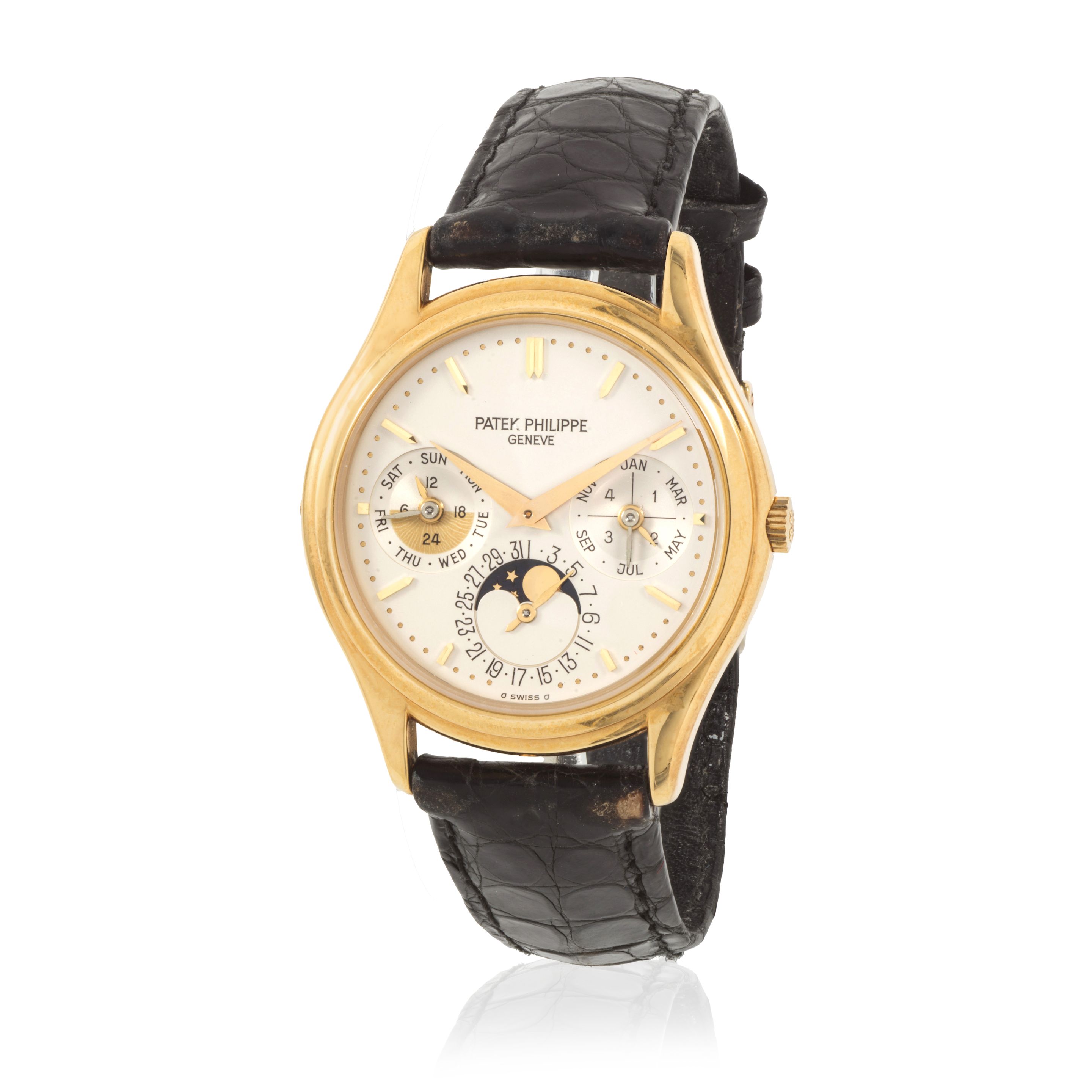 32: Patek Philippe. A fine 18K gold automatic perpetual calendar wristwatch with moon phase and sigma dial Patek Philippe. Belle montre bracelet en or jaune 18K (750) calendrier perpétuel, phases de lune et cadran sigma mouvement automatique Perpetual Calendar, Ref: 3940, Purchased 22nd November 1999