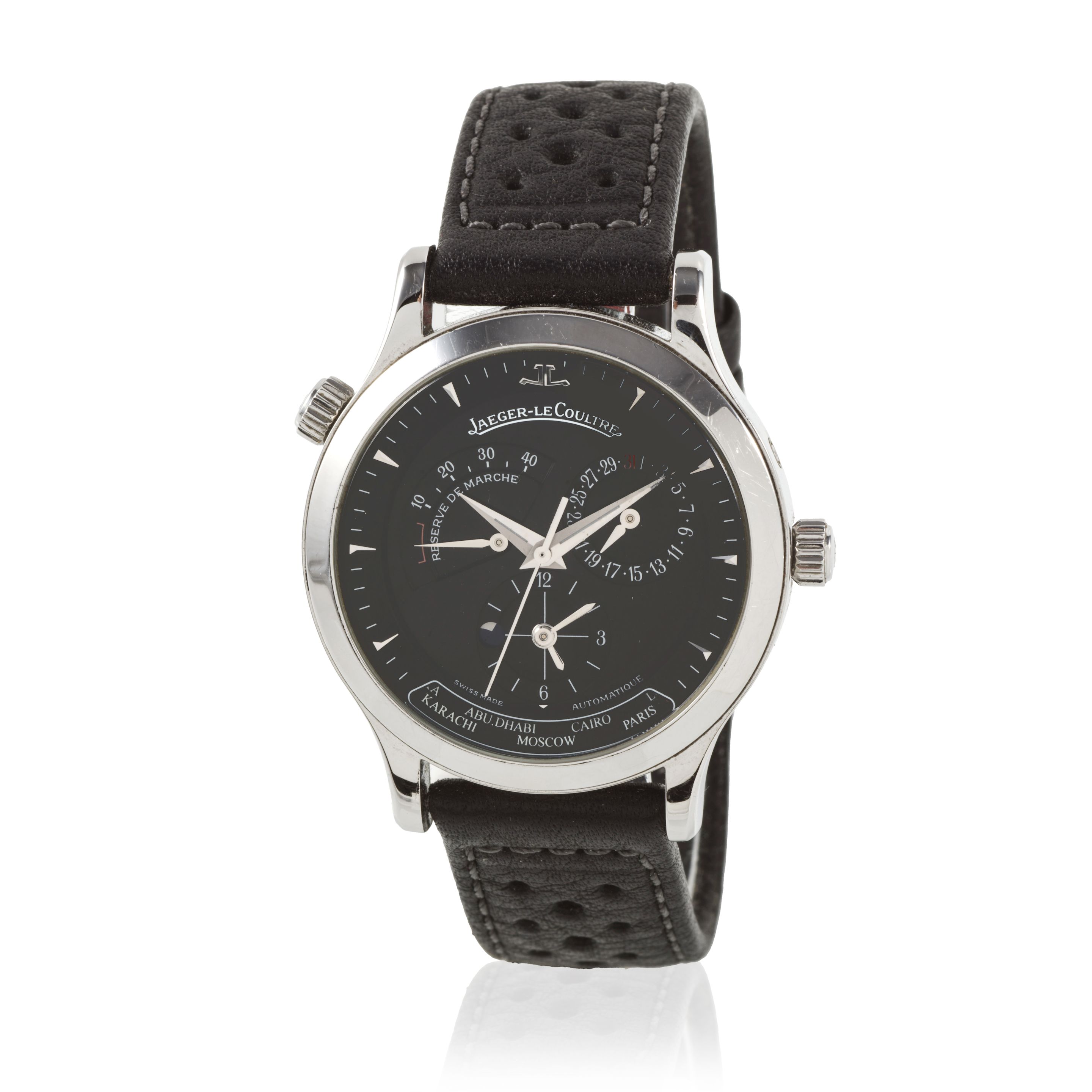 46: Jaeger-LeCoultre. A stainless steel automatic wristwatch with power reserve, day/night, dual time indication and calendar Jaeger-LeCoultre. Montre bracelet en acier avec date, indication de réserve de marche, indication jour/nuit et second fuseau horaire mouvement automatique Master Geographic , Ref: 142.8.92.S, Purchased 8th March 2002