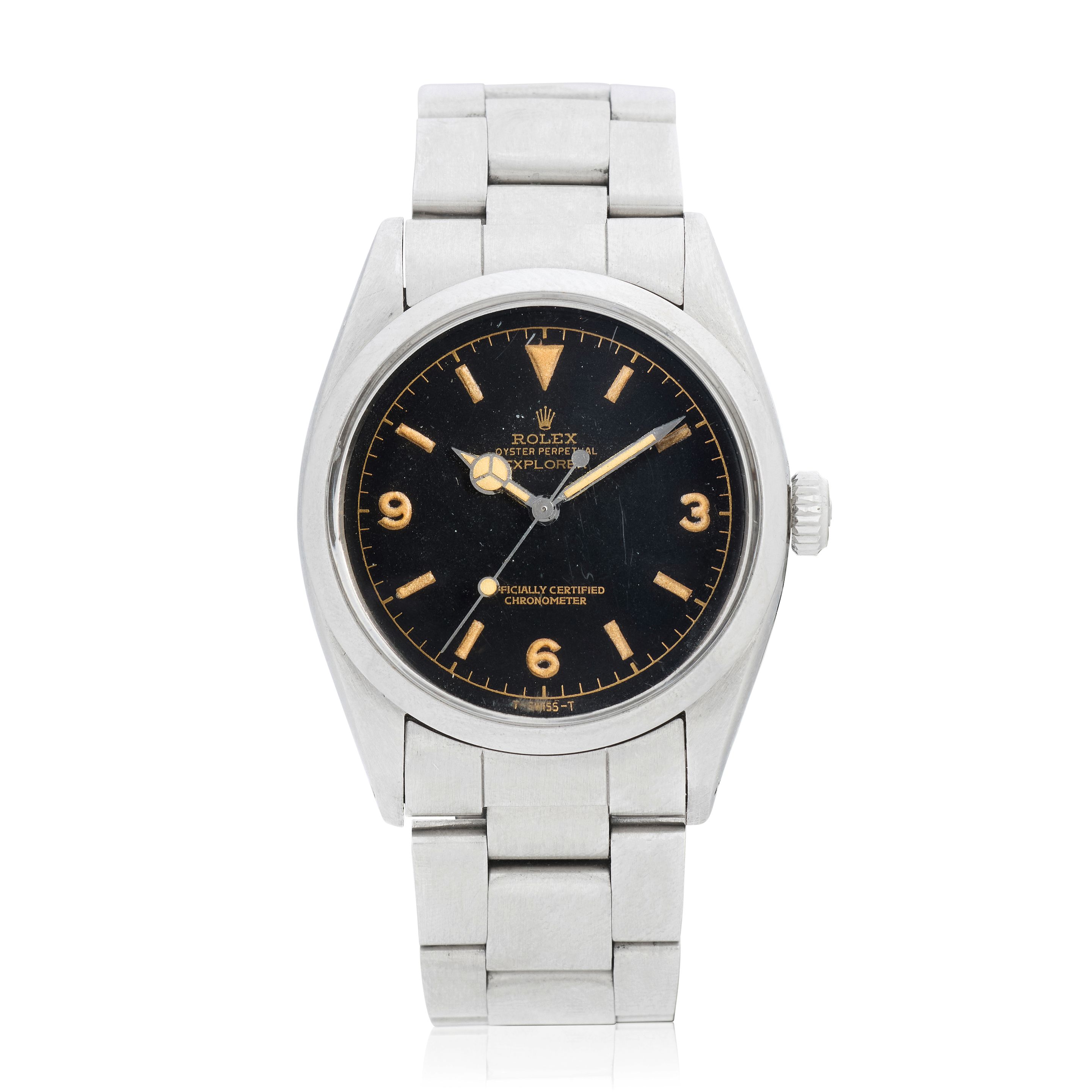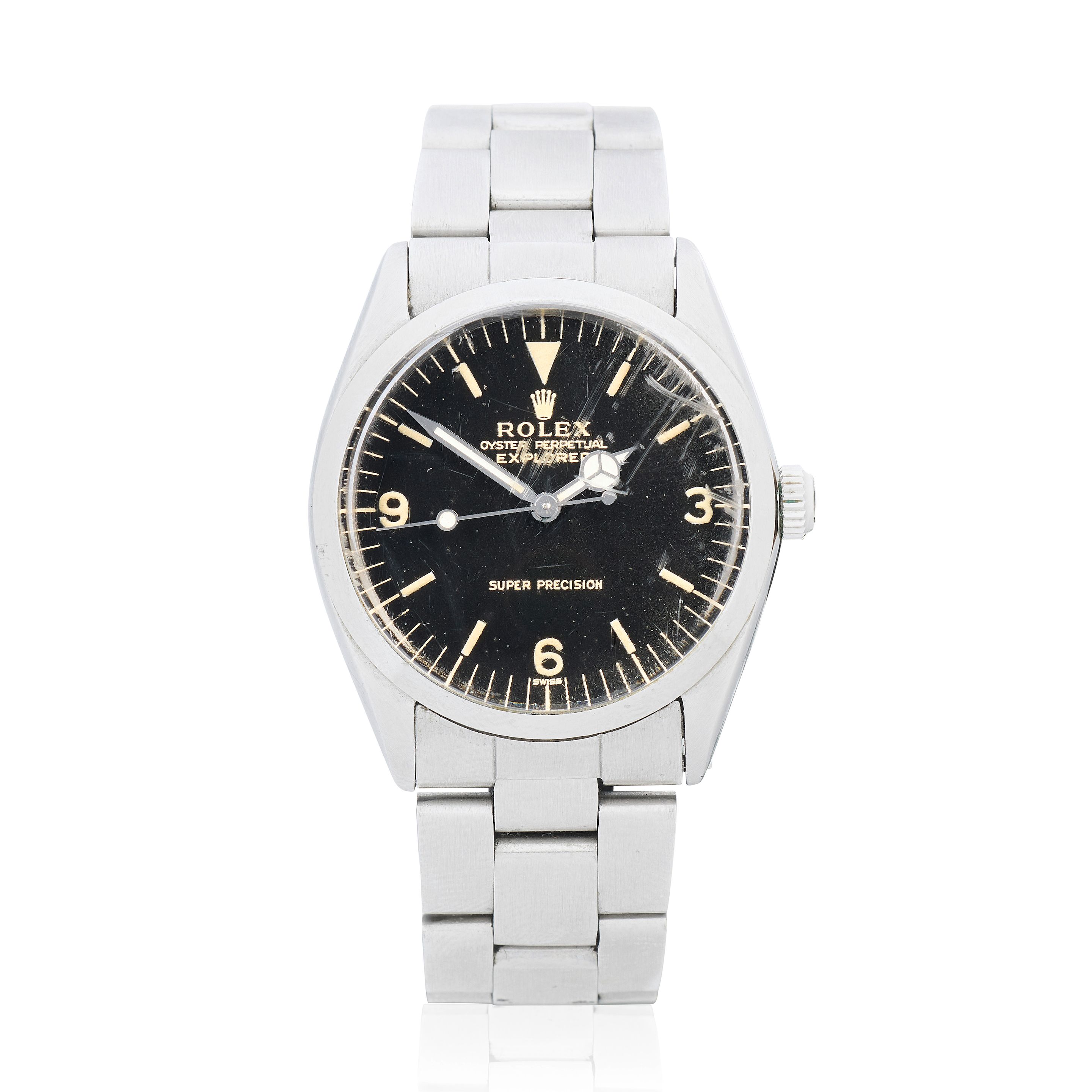 35: Rolex. A stainless steel automatic bracelet watch with gilt gloss dial offered on behalf of the family of the original owner Explorer, Ref: 5500, Purchased 14th February 1966