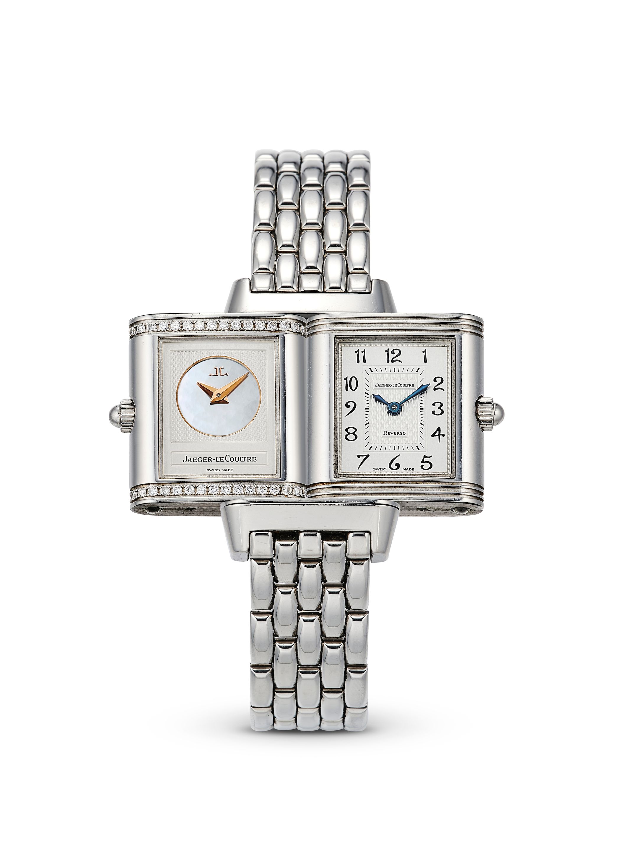 1021: JAEGER-LECOULTRE | REVERSO DUETTO, REF.266.842.443B, A STAINLESS STEEL AND DIAMOND-SET DUOFACE BRACELET WATCH WITH MOTHER-OF-PEARL DIAL, CIRCA 2000