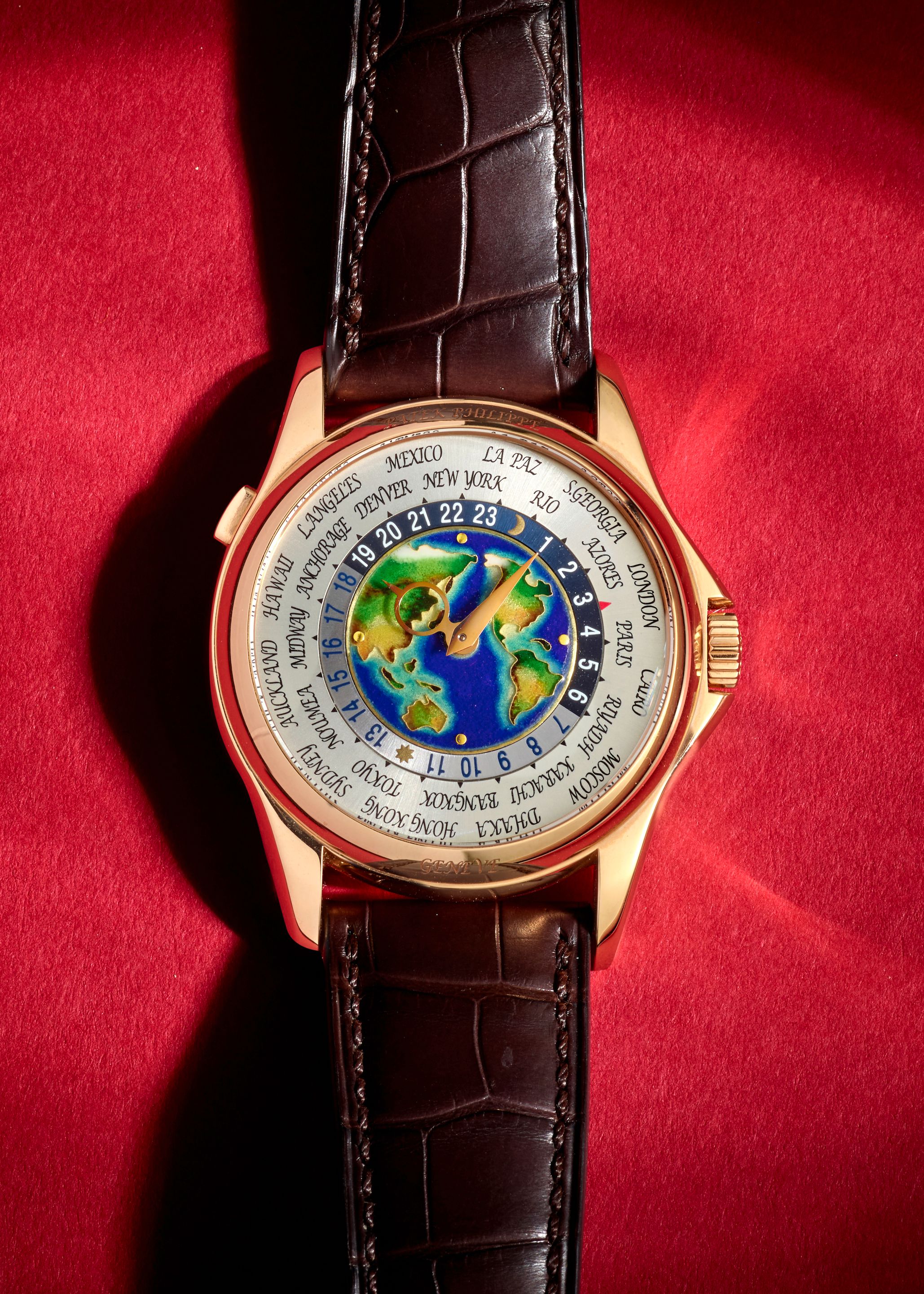 6089115: PATEK PHILIPPPE. A FINE AND ATTRACTIVE 18K ROSE GOLD AUTOMATIC WORLD TIME WRISTWATCH WITH CLOISONNÉ ENAMEL DIAL World Time, Ref: 5131R-001, Purchased 3rd October, 2015