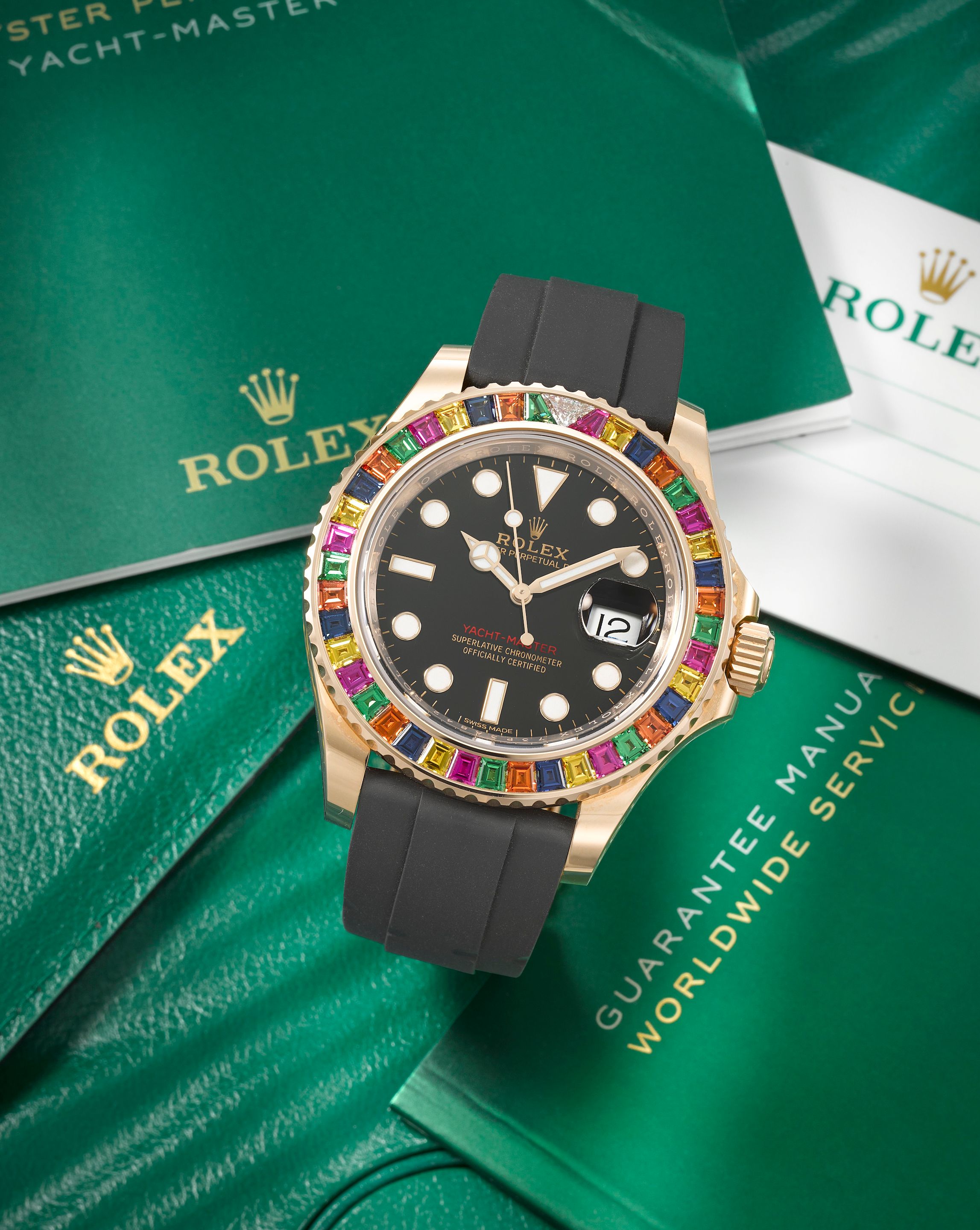 28: Rolex. A fine and rare 18K rose gold sapphire, tsavorite and diamond set automatic calendar wristwatch Yacht-Master 'Tutti Frutti'/'Haribo', Ref: 116695SATS, Purchased 24th March 2018