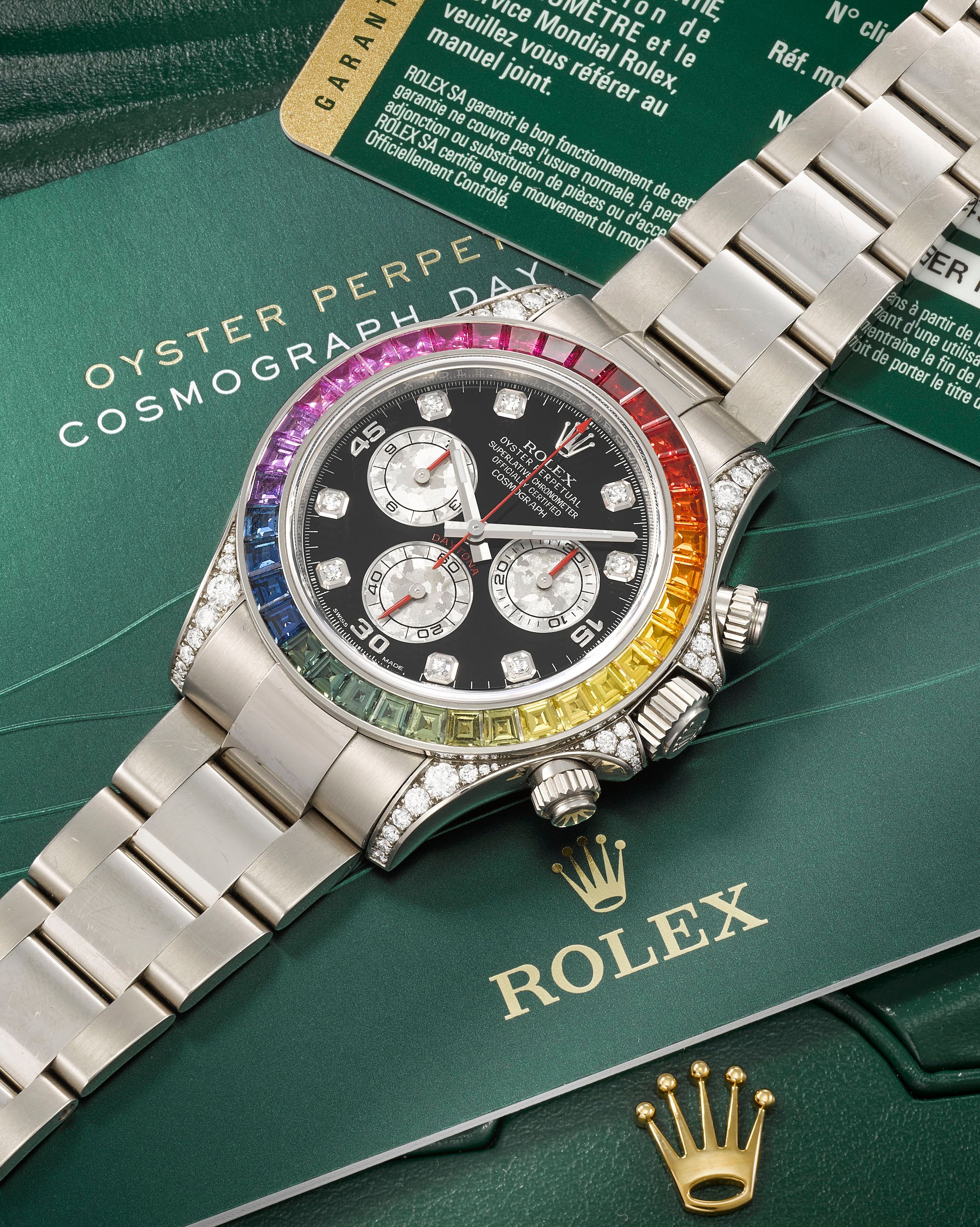 30: Rolex. A fine, rare and exceptional 18K white gold diamond and multi-coloured sapphire set automatic chronograph bracelet watch Cosmograph Daytona 'Rainbow', Ref: 116599RBOW, Purchased 23rd March 2013
