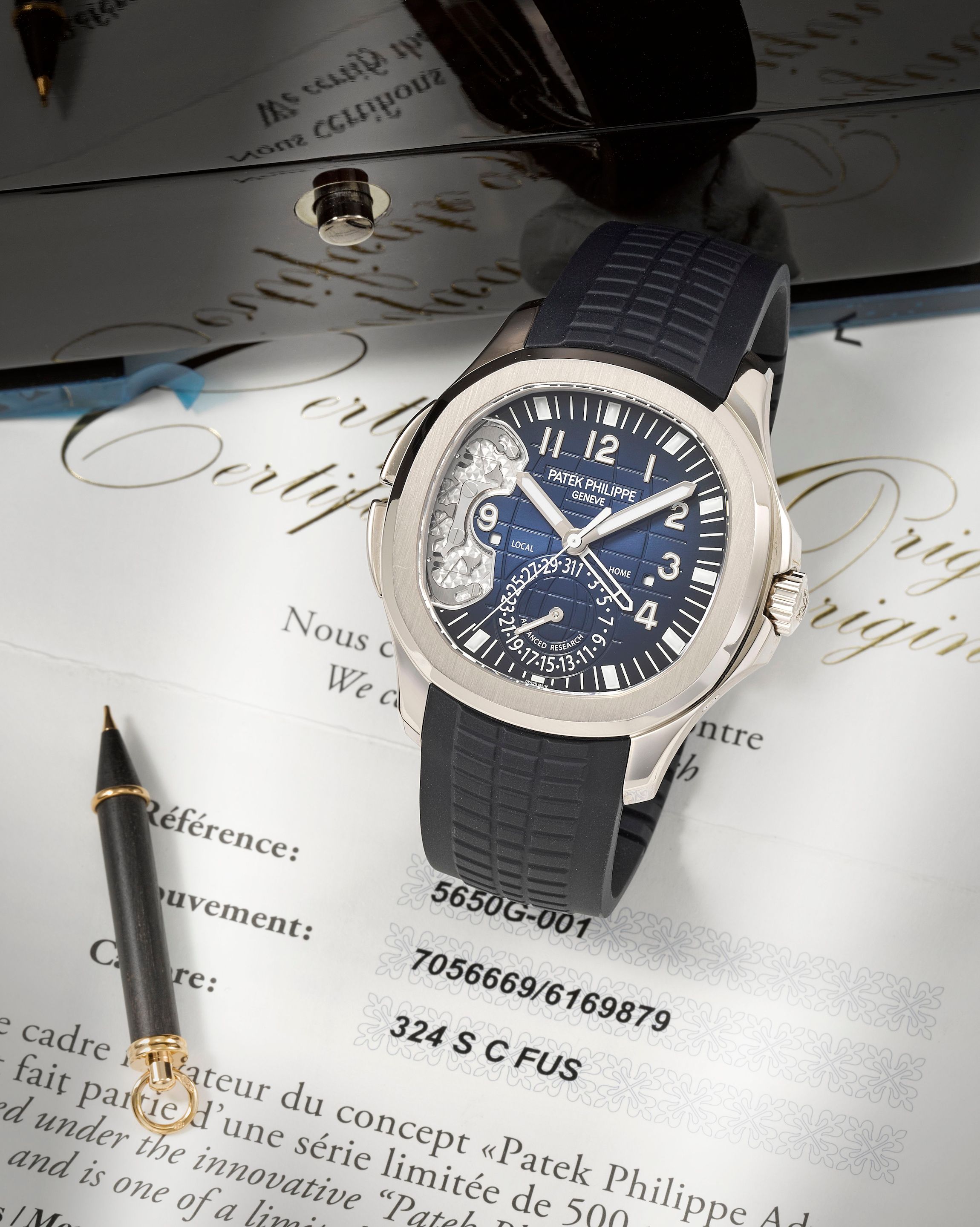 32: Patek Philippe. A fine, rare and innovative Limited Edition 18K white gold automatic calendar wristwatch with dual time zone and day/night indication Aquanaut Travel Time Advanced Research, One of 500, Ref: 5650G-001, Purchased 21st June 2017