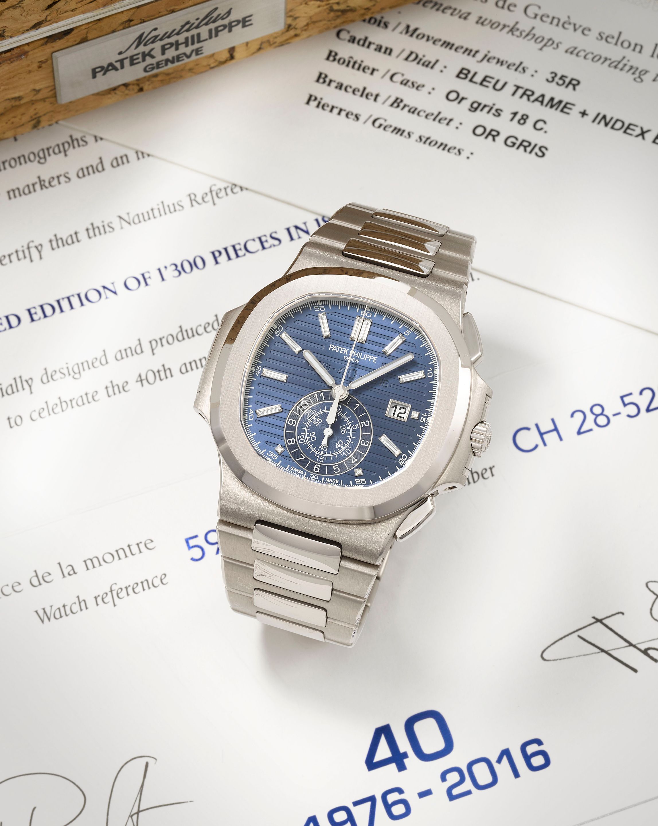 33: Patek Philippe. A very fine and rare Limited Edition Anniversary 18K white gold diamond set automatic calendar flyback chronograph bracelet watch 40th Anniversary Nautilus, Ref: 5976/1G-001, Purchased 1st April 2017