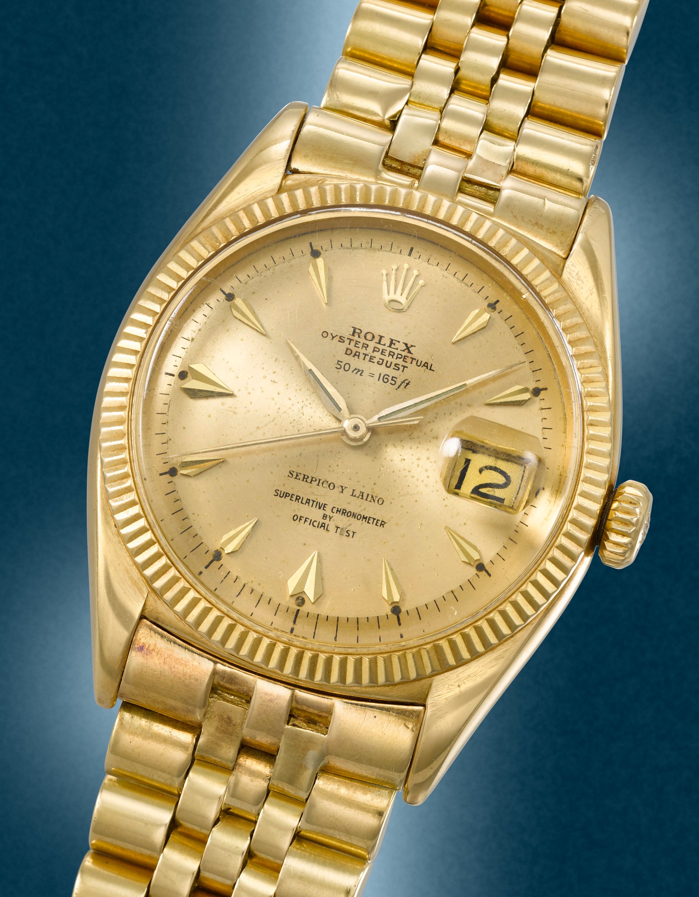 39: Rolex. A fine and rare 18K gold automatic calendar bracelet watch with depth rating and 'Superlative Chronometer By Official Test' dial retailed by Serpico Y Laino Datejust, Ref: 6605, Circa 1956
