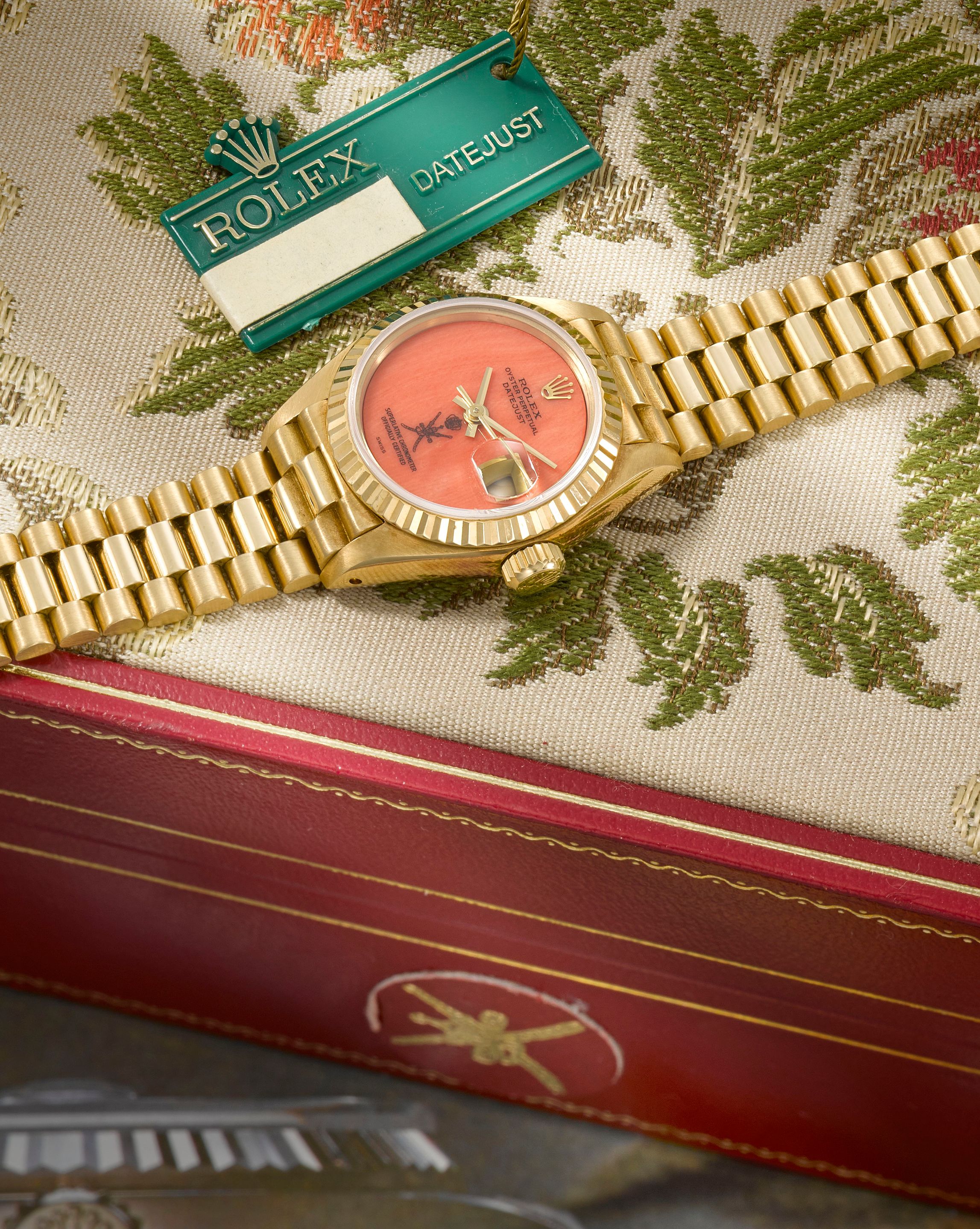 25: Rolex. A fine and rare lady's 18K gold automatic calendar bracelet watch with coral dial featuring the emblem of Oman Datejust, Ref: 69178, Circa 1984