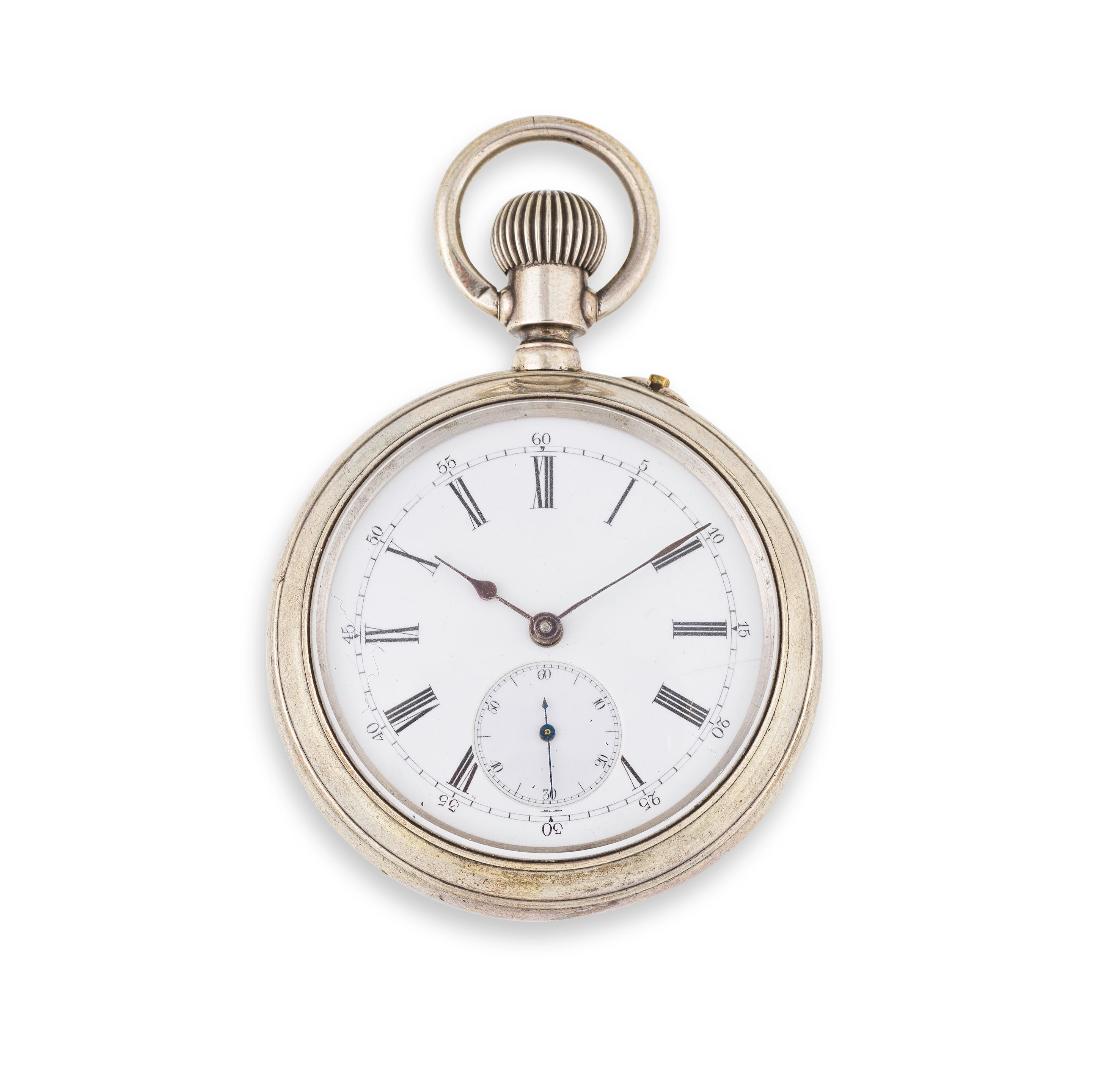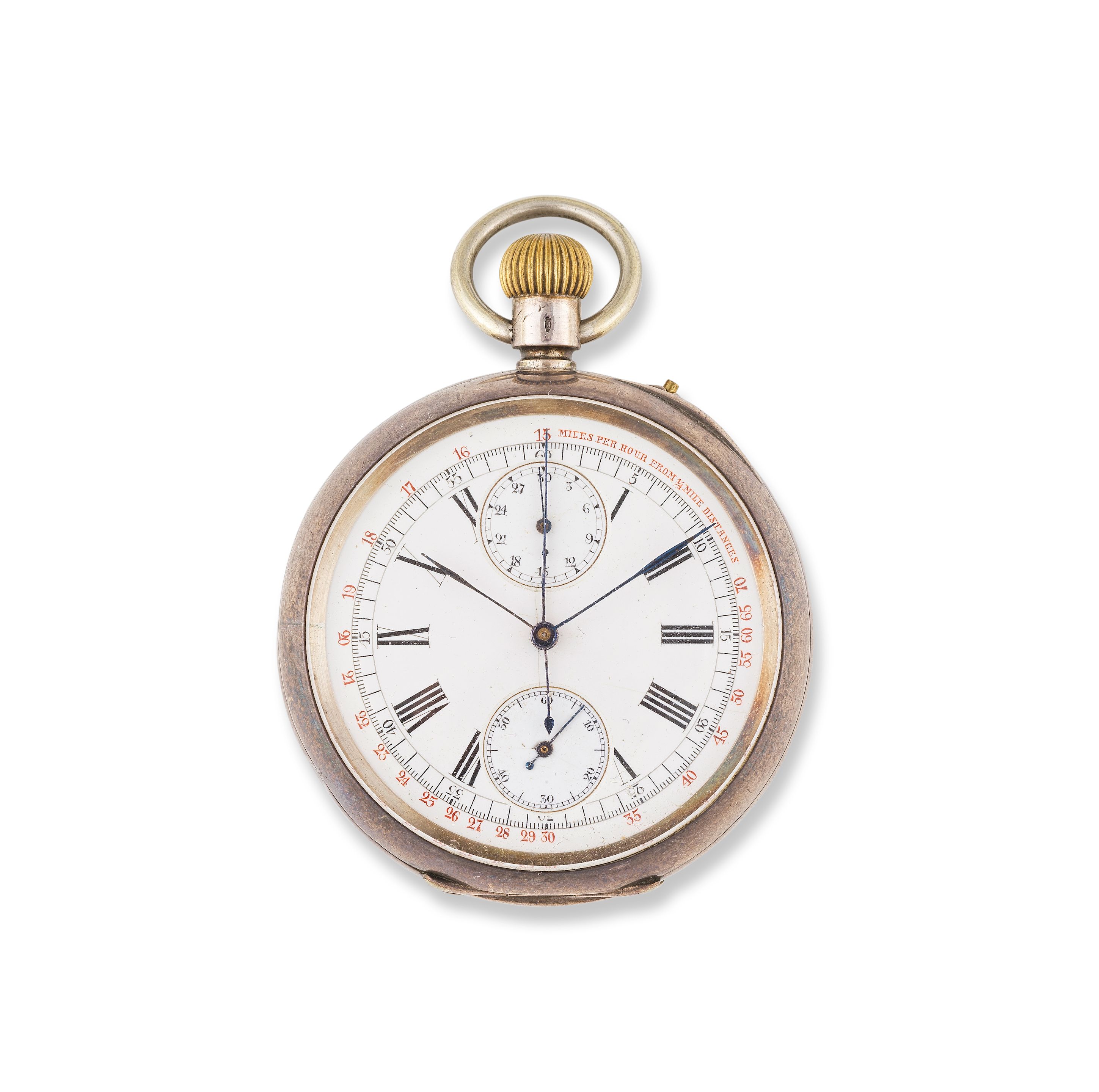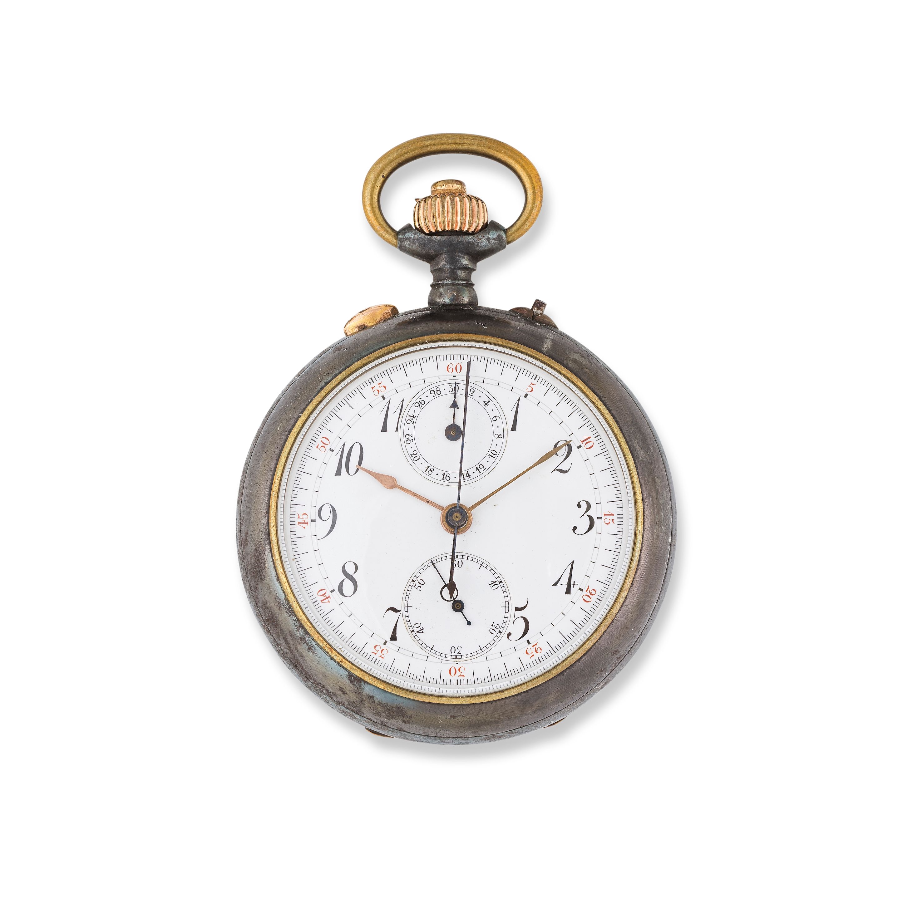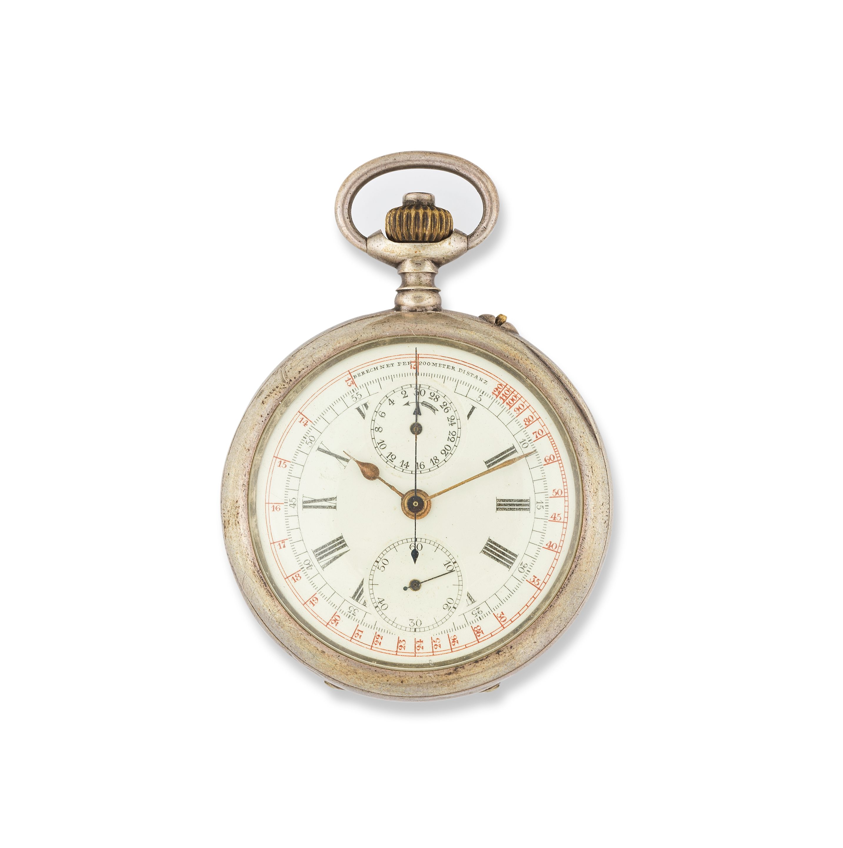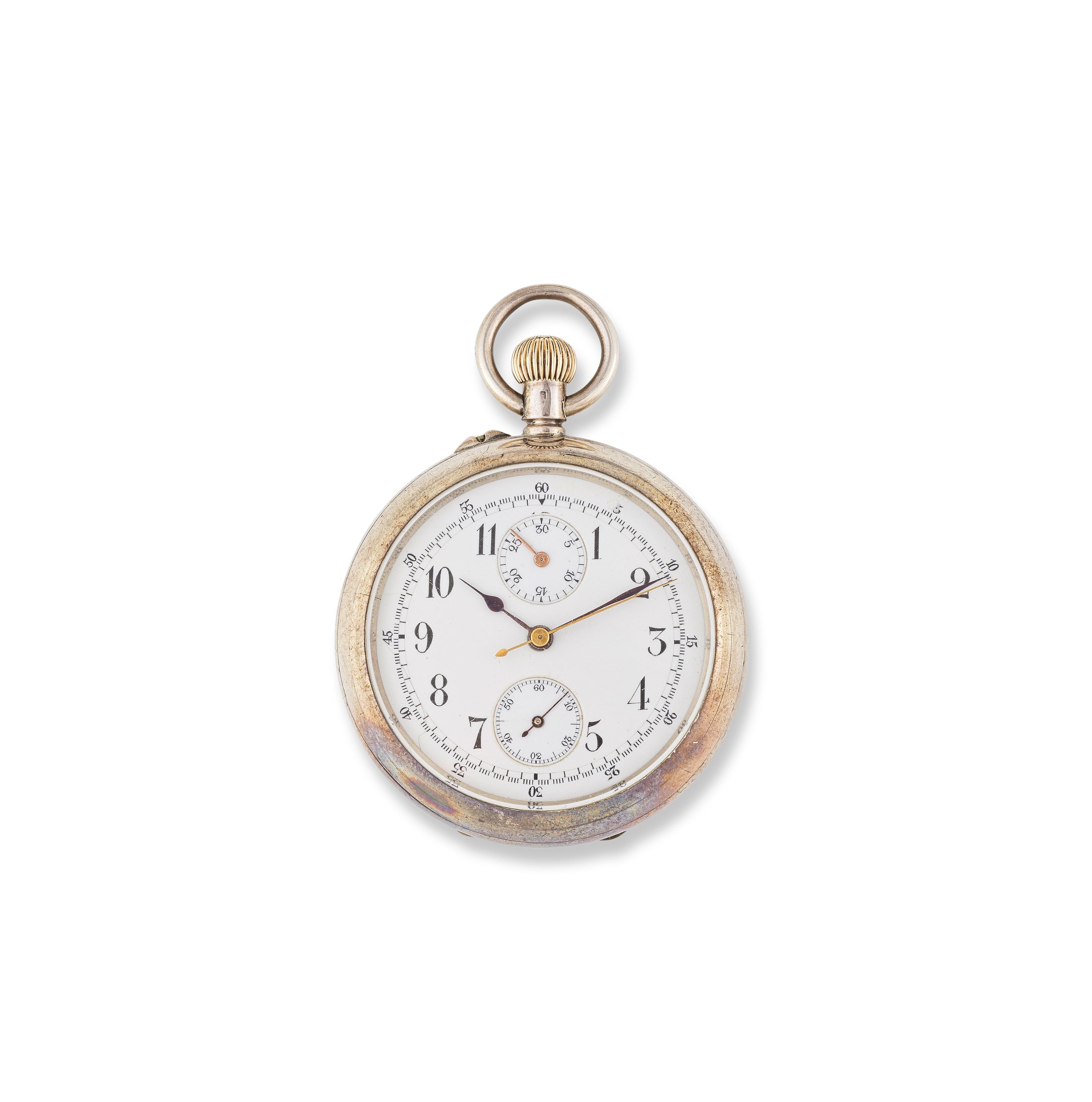 4: A silver and niello keyless wind open face chronograph pocket watch Chronographe de poche à cadran ouvert en nielle et argent (800) remontoir au pendant Circa 1900