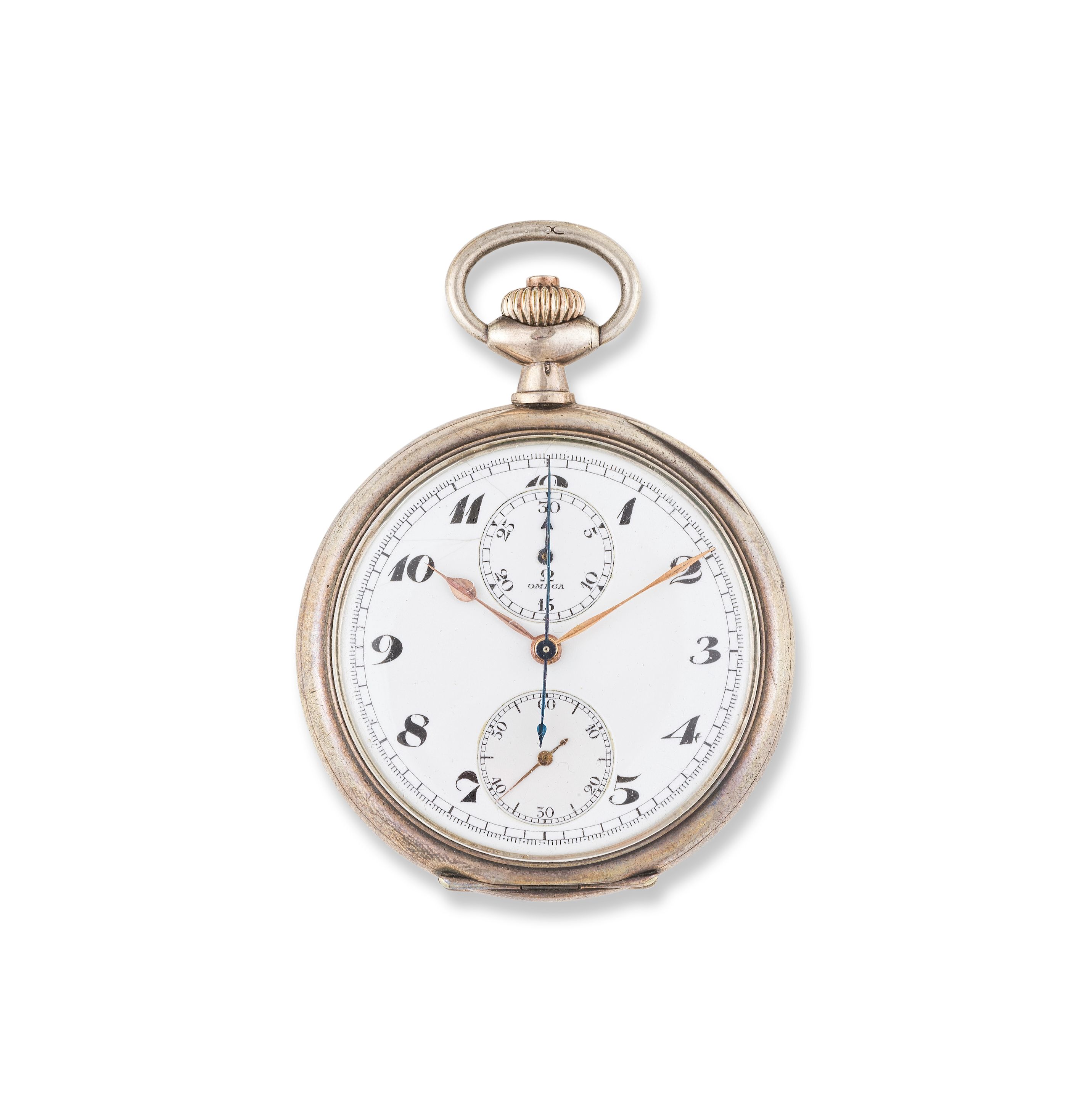 1: Omega. A silver keyless wind open face chronograph pocket watch Omega. Chronographe de poche à cadran ouvert en argent (800) remontoir au pendant Circa 1915