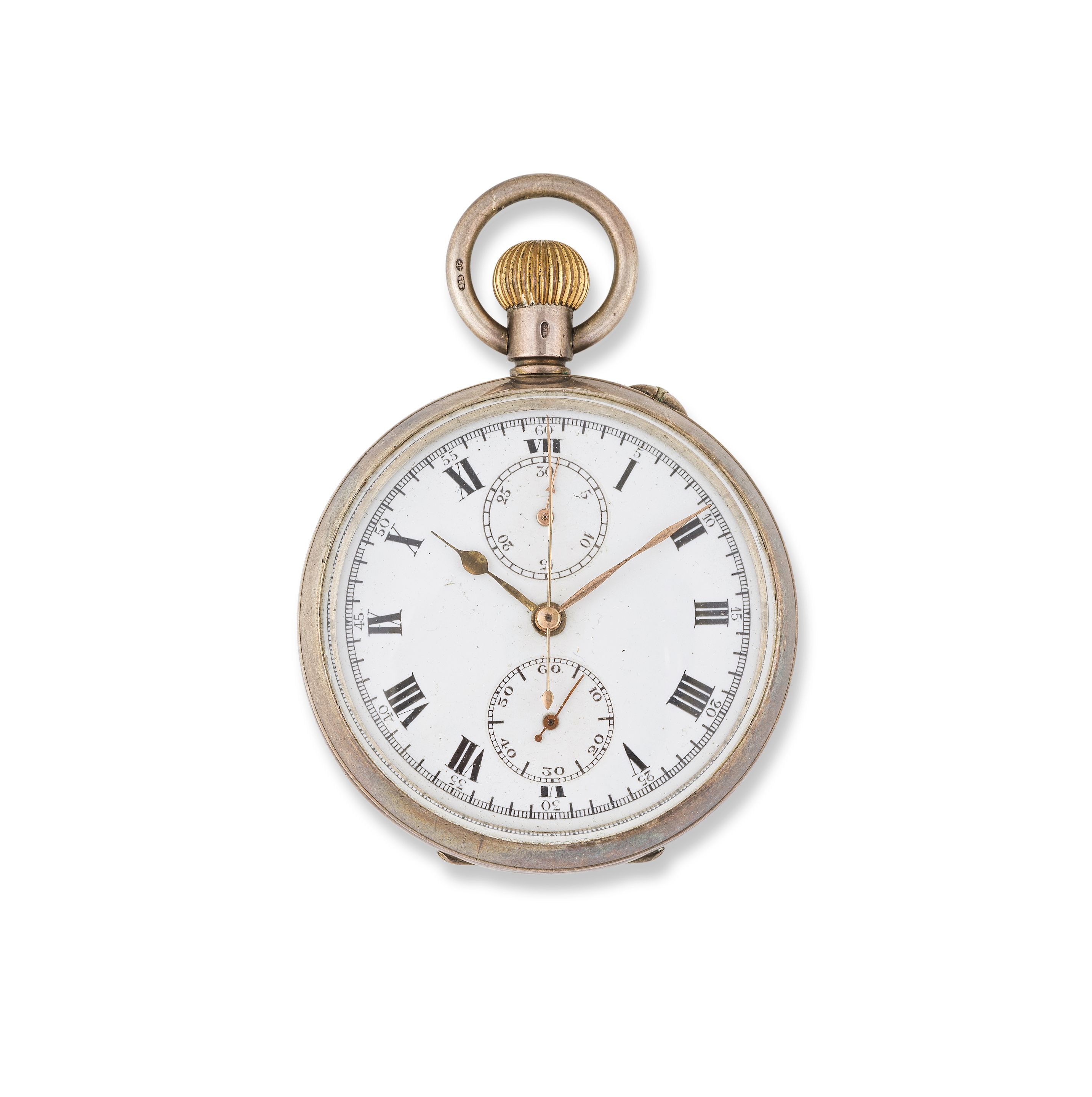 5: A silver keyless wind open face chronograph pocket watch Chronographe de poche à cadran ouvert en argent (800) remontoir au pendant London Import mark for 1925